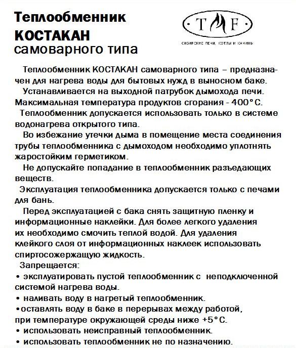 Теплообменник «Костакан», названный по имени вулкана на Камчатке, предназначен для нагрева воды в выносном баке, который устанавливается отдельно в моечном помещении. Увеличенный объем теплообменника (9 литров) позволяет быстро нагревать воду в баках большого объема. В теплообменнике «Костакан» используется арматура со стандартными присоединительными размерами G3/4 с наружной резьбой.
