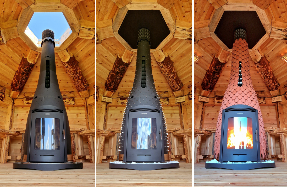 Декор построен на сочетании нерукотворного и рукотворного элементов: чешуя, встречающаяся в природе, и терракотовая керамика — обожжённая глина. Терракота — древнейший синтетический материал человечества и самый древний материал для изготовления печей, ещё со времён, когда люди обмазывали глиной свои очаги.Мягкое тепловое излучение.