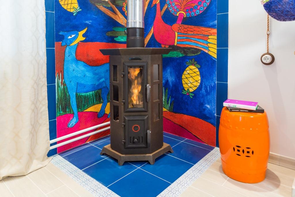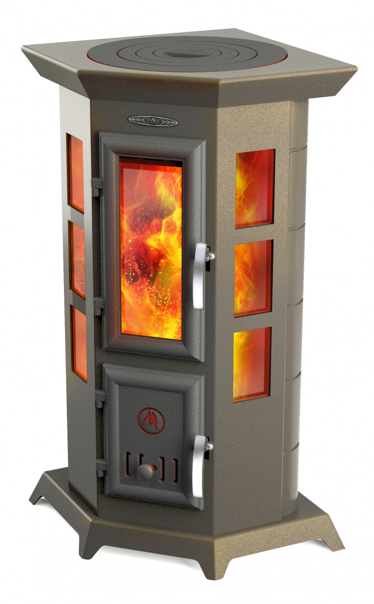 Дополнительно к остеклению дверцы у этой печи имеется большой остекленный эркер, набранный из шести отдельных стекол. При этом, за счет углового расположения печи, огонь в окошках хорошо видно в любой точке помещения.