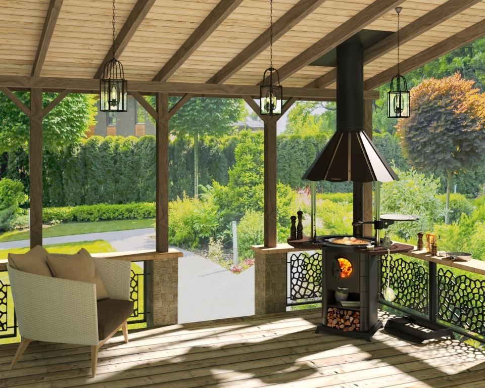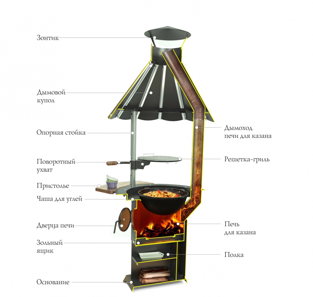 Дымовой купол служит для сбора и вытяжки дыма через отверстие в его верхней части, а также защитой от осадков. Во время приготовления блюд в казане весь дым от печи выходит через дымоход под купол. Растопив встроенную печь, можно быстро создать устойчивую тягу в дымоходе гриля.